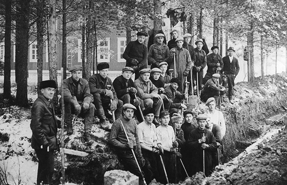 Maamieskoulun pojat kaivavat sirpalesuojia yhteislyseon pihalle. Vas. koulun johtaja Oskari Valanne. Kuva: Väinö Marttila.